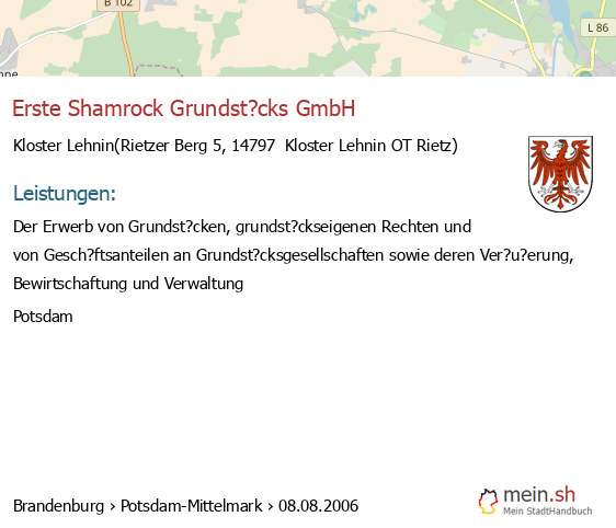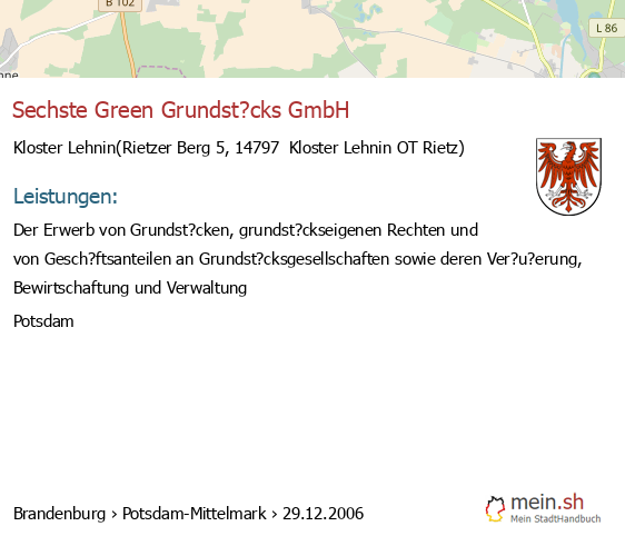 bei Kloster Lehnin seit 12/2006Leistungen: Der Erwerb von Grundst?cken, grundst?ckseigenen Rechten und von Gesch?ftsanteilen an Grundst?cksgesellschaften sowie deren Ver?u?erung, Bewirtschaftung und Verwaltung..
