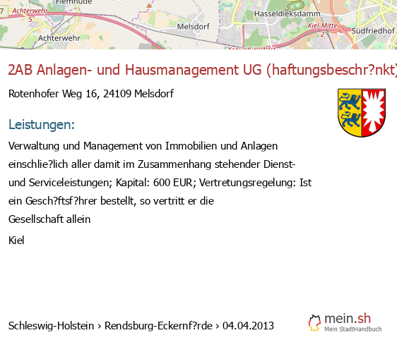 bei Kiel seit 4/2016Leistungen: Technischer Betrieb eines Onlineportals zum Verkauf von Gebrauchsg?tern unter Verwendung eines nicht zulassungspflichtigen Losverfahrens; Kapital: 300 EUR; Gesch?ftsanschrift: D?rpsdiek 33, 24109 Melsdorf; Vertretungsregelung: Ist nur ein Gesch?ftsf?hrer bestellt, so vertritt..