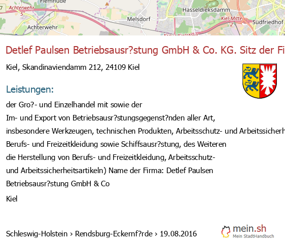 Detlef Paulsen Betriebsausr?stung GmbH & Co. KG. Sitz der Firma Kiel. Gesch?ftsanschrift Skandinaviendamm , Kiel. Vertretungsregelung Jeder pers?nlich haftende Gesellschafter vertritt die Gesellschaft allein. Jeder pers?nlich haftende Gesellschafter darf Rechtsgesch?fte mit sich selbst oder als Vertreter Dritter abschlie?en. Pers?nlich haftende Gesellschafterin Detlef Paulsen Gesch?ftsf?hrung GmbH, Kiel (Amtsgericht Kiel, KI). Rechtsform Kommanditgesellschaft.