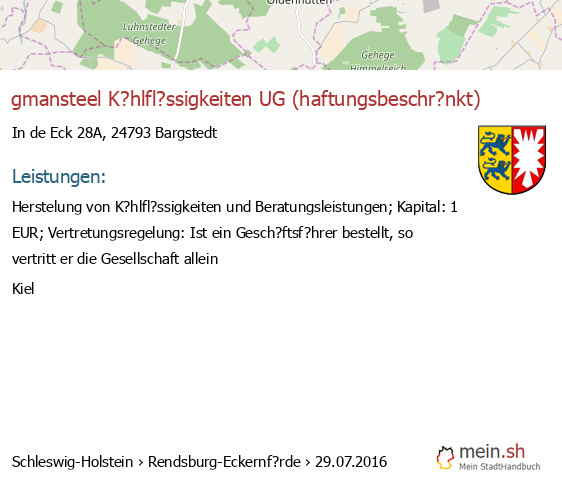 bei Bargstedt seit 7/2016Leistungen: Herstelung von K?hlfl?ssigkeiten und Beratungsleistungen; Kapital: 1 EUR; Vertretungsregelung: Ist ein Gesch?ftsf?hrer bestellt, so vertritt er die Gesellschaft allein..