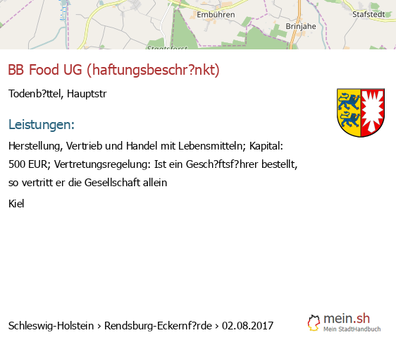 bei Haale seit 8/2017Leistungen: Herstellung, Vertrieb und Handel mit Lebensmitteln; Kapital: 500 EUR; Vertretungsregelung: Ist ein Gesch?ftsf?hrer bestellt..