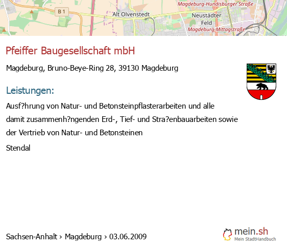 bei Magdeburg seit 6/2009Leistungen: Ausf?hrung von Natur- und Betonsteinpflasterarbeiten und alle damit zusammenh?ngenden Erd-, Tief- und Stra?enbauarbeiten sowie der Vertrieb von Natur- und Betonsteinen..