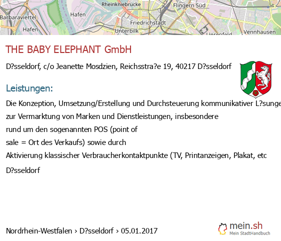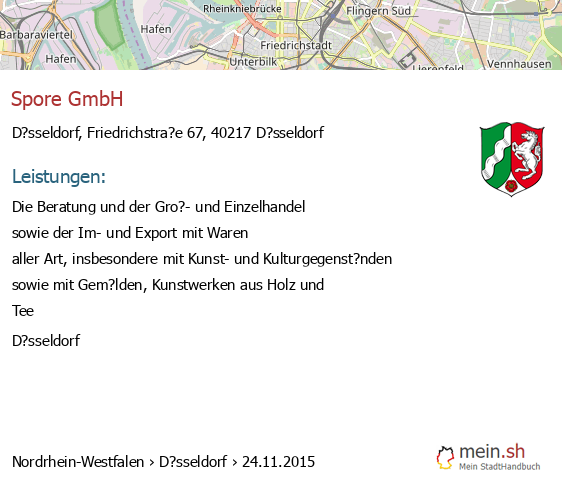 Die Informationen dieser Seite über D?sseldorf in Nordrhein-Westfalen wurden durch uns mit Recherche öffentlicher Kreisfreie Stadt D?sseldorf Quellen erstellt, und können fehlerbehaftet oder veraltet sein. Für Öffnungszeiten schauen Sie bitte auf die Seite der D?sseldorfer Anbieter. Für den Gesellschafter, die Bilanz, den Jahresabschluss, Umsatz und Gewinn empfehlen wir, den Bundesanzeiger zu nutzen. Wenn 40217 D?sseldorf Einträge aktualisiert oder entfernt werden müssen, geben Sie uns bitte einen Hinweis.