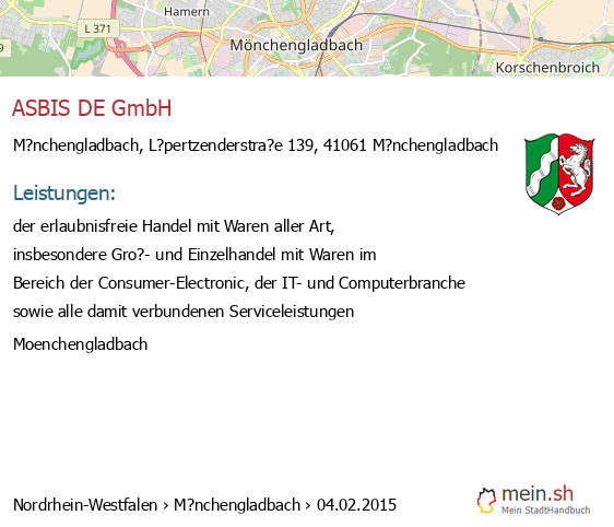 Die Informationen dieser Seite über M?nchengladbach in Nordrhein-Westfalen wurden durch uns mit Recherche öffentlicher Kreisfreie Stadt M?nchengladbach Quellen erstellt, und können fehlerbehaftet oder veraltet sein. Für Öffnungszeiten schauen Sie bitte auf die Seite der M?nchengladbacher Anbieter. Für den Gesellschafter, die Bilanz, den Jahresabschluss, Umsatz und Gewinn empfehlen wir, den Bundesanzeiger zu nutzen. Wenn 41061 M?nchengladbach Einträge aktualisiert oder entfernt werden müssen, geben Sie uns bitte einen Hinweis.