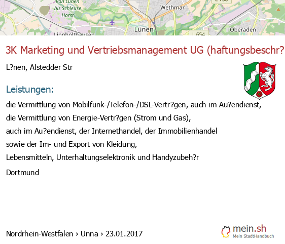 Die Informationen dieser Seite über L?nen in Nordrhein-Westfalen wurden durch uns mit Recherche öffentlicher Landkreis Unna Quellen erstellt, und können fehlerbehaftet oder veraltet sein. Für Öffnungszeiten schauen Sie bitte auf die Seite der L?nener Anbieter. Für den Gesellschafter, die Bilanz, den Jahresabschluss, Umsatz und Gewinn empfehlen wir, den Bundesanzeiger zu nutzen. Wenn 44534 L?nen Einträge aktualisiert oder entfernt werden müssen, geben Sie uns bitte einen Hinweis.