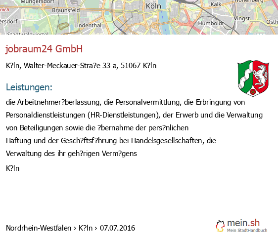 bei K?ln seit 7/2016Leistungen: die Arbeitnehmer?berlassung, die Personalvermittlung, die Erbringung von Personaldienstleistungen (HR-Dienstleistungen), der Erwerb und die Verwaltung von Beteiligungen sowie die ?bernahme der pers?nlichen Haftung und der Gesch?ftsf?hrung bei Handelsgesellschaften, die..