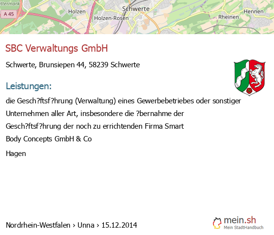 bei Schwerte seit 12/2014Leistungen: die Gesch?ftsf?hrung (Verwaltung) eines Gewerbebetriebes oder sonstiger Unternehmen aller Art, insbesondere die ?bernahme der Gesch?ftsf?hrung der noch zu errichtenden Firma Smart..