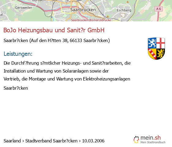 bei Saarbr?cken seit 3/2006Leistungen: Die Durchf?hrung s?mtlicher Heizungs- und Sanit?rarbeiten, die Installation und Wartung von Solaranlagen sowie der Vertrieb, die Montage und Wartung von Elektroheizungsanlagen..