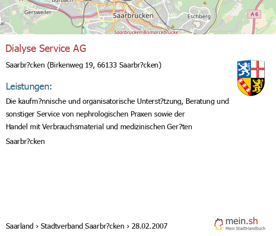 bei Saarbr?cken seit 2/2007Leistungen: Die kaufm?nnische und organisatorische Unterst?tzung, Beratung und sonstiger Service von nephrologischen Praxen sowie der Handel mit Verbrauchsmaterial und medizinischen Ger?ten.