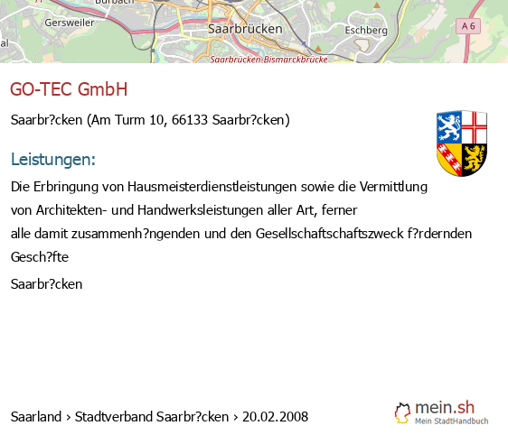 bei Saarbr?cken seit 2/2008Leistungen: Die Erbringung von Hausmeisterdienstleistungen sowie die Vermittlung von Architekten- und Handwerksleistungen aller Art, ferner alle damit zusammenh?ngenden und den Gesellschaftschaftszweck f?rdernden Gesch?fte..