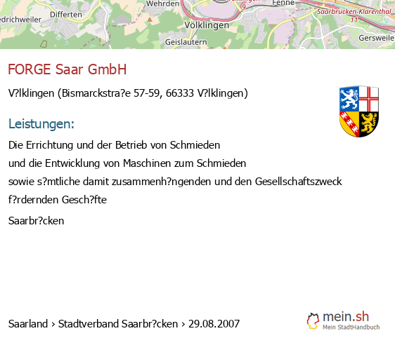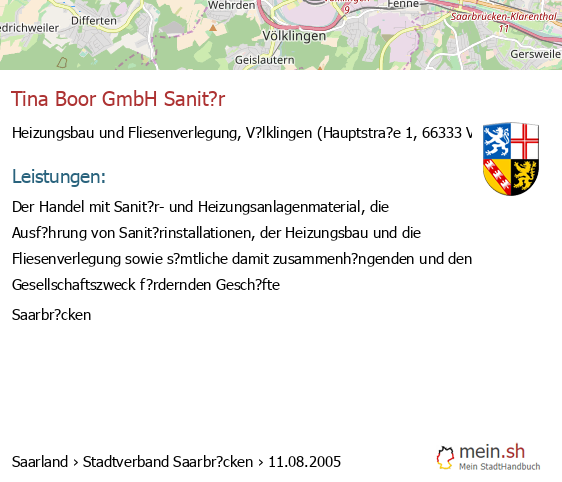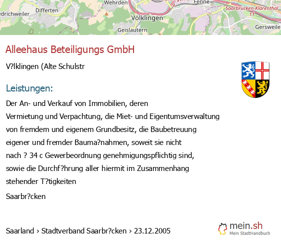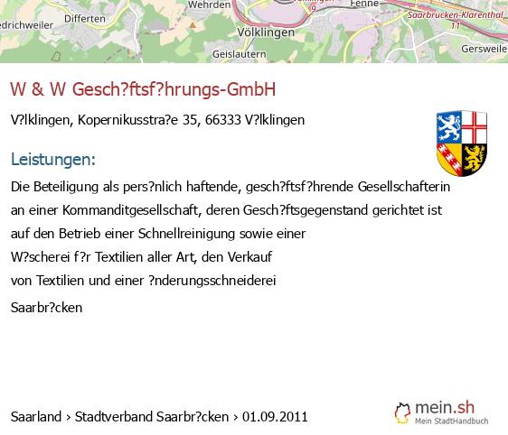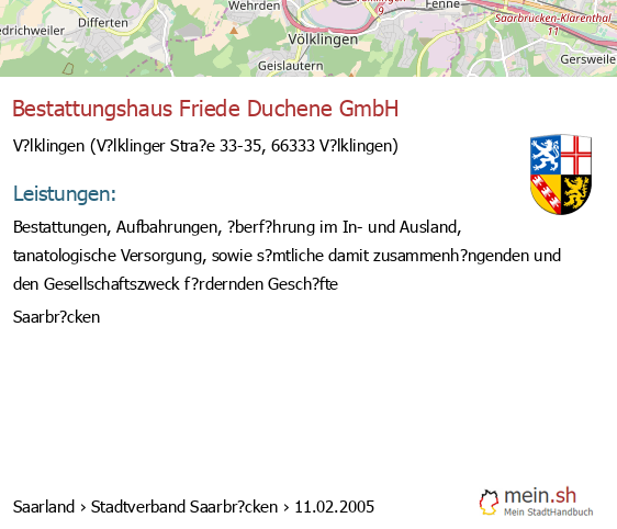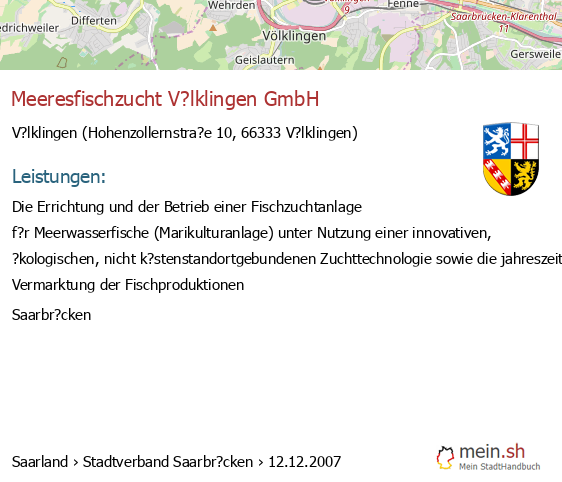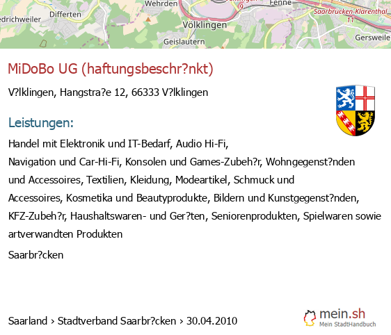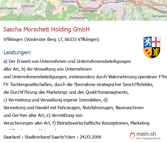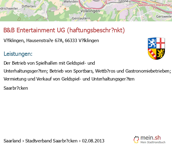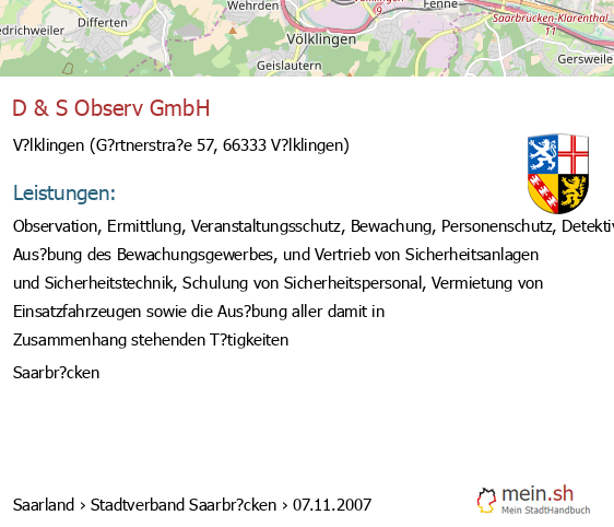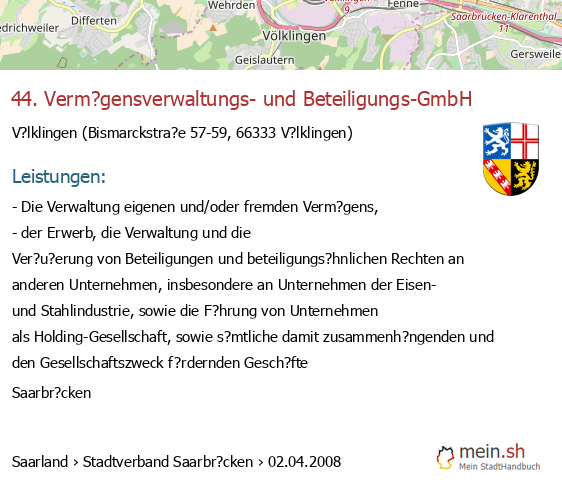 bei V?lklingen seit 9/2005V?lklingen (Karolinger Stra?e 1, 66333 V?lklingen, Betrieb einer Werbeagentur sowie Vermittlung von Versicherungsgesch?ften)