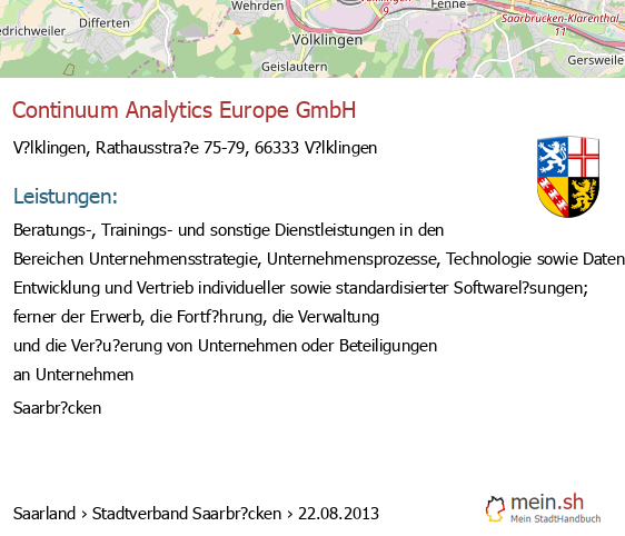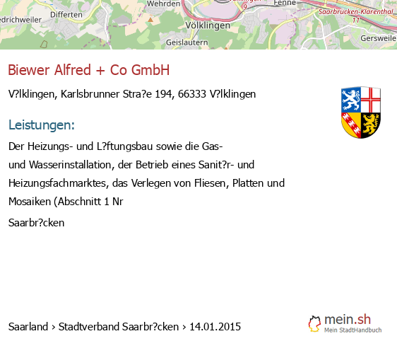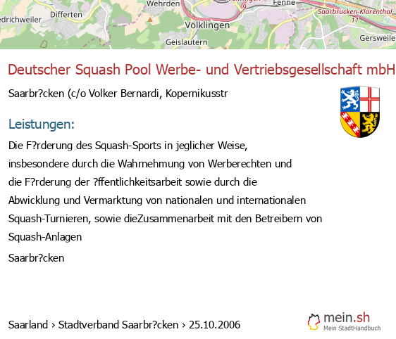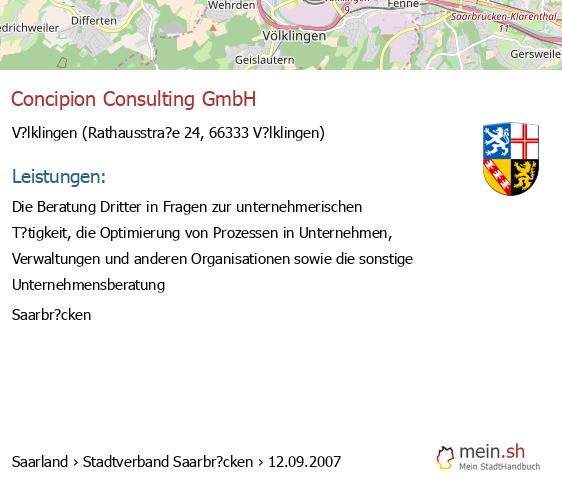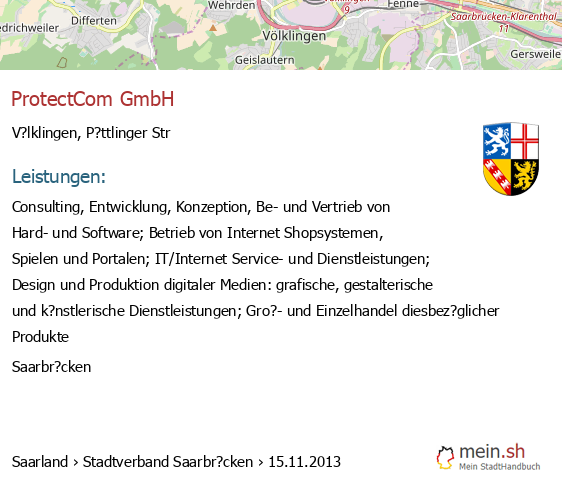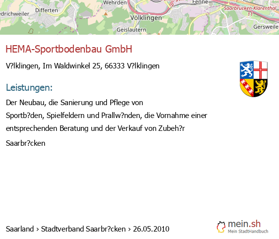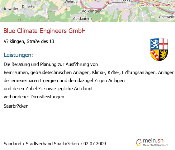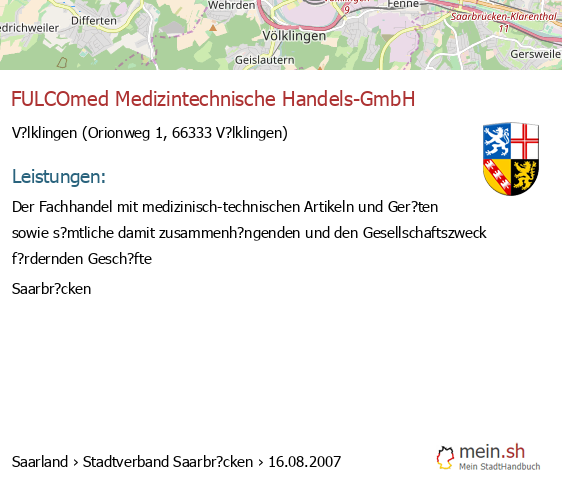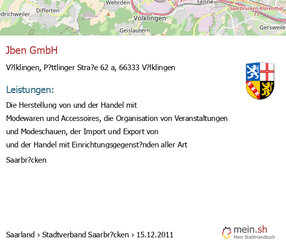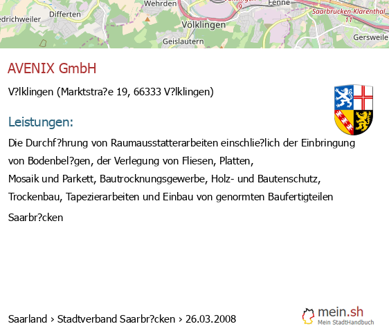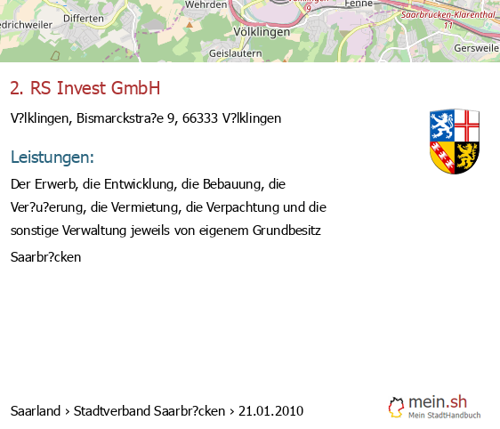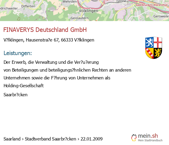 bei V?lklingen seit 9/2005V?lklingen (Karolinger Stra?e 1, 66333 V?lklingen, Betrieb einer Werbeagentur sowie Vermittlung von Versicherungsgesch?ften)