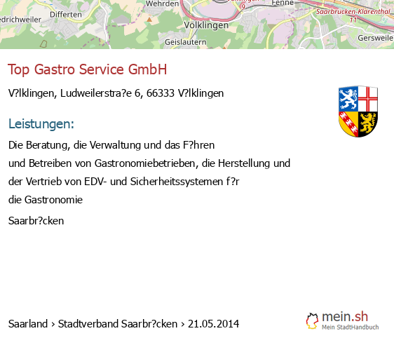Die Informationen dieser Seite über V?lklingen in Saarland wurden durch uns mit Recherche öffentlicher Landkreis Stadtverband Saarbr?cken Quellen erstellt, und können fehlerbehaftet oder veraltet sein. Für Öffnungszeiten schauen Sie bitte auf die Seite der V?lklingener Anbieter. Für den Gesellschafter, die Bilanz, den Jahresabschluss, Umsatz und Gewinn empfehlen wir, den Bundesanzeiger zu nutzen. Wenn 66333 V?lklingen Einträge aktualisiert oder entfernt werden müssen, geben Sie uns bitte einen Hinweis.