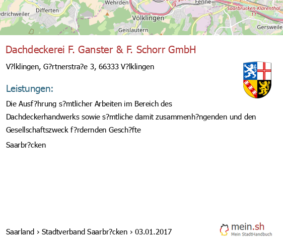 bei V?lklingen seit 1/2017Leistungen: Die Ausf?hrung s?mtlicher Arbeiten im Bereich des Dachdeckerhandwerks sowie s?mtliche damit zusammenh?ngenden und den Gesellschaftszweck f?rdernden..