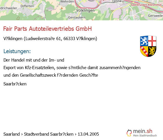 bei V?lklingen seit 2/2006V?lklingen (Hauptstra?e 356, 66333 V?lklingen, Unternehmensgegenstand: Der Handel (Import und Export) mit Waren aller Art, die keiner Erlaubnispflicht unterliegen