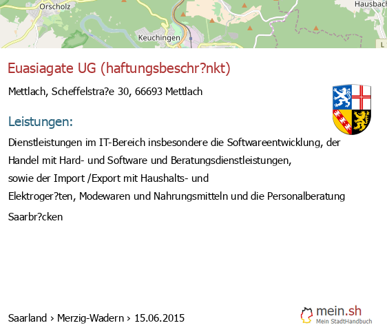 bei Mettlach seit 6/2015Leistungen: Dienstleistungen im IT-Bereich insbesondere die Softwareentwicklung, der Handel mit Hard- und Software und Beratungsdienstleistungen, sowie der Import /Export mit Haushalts- und..