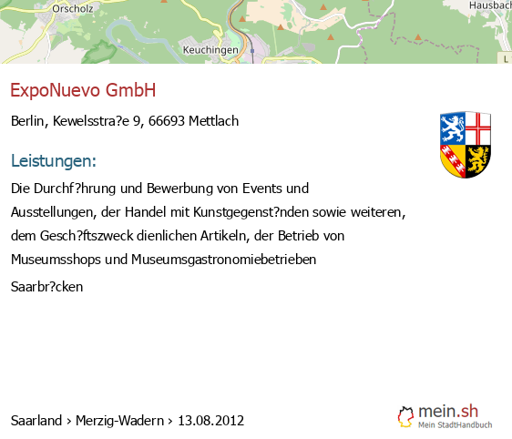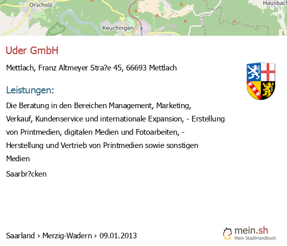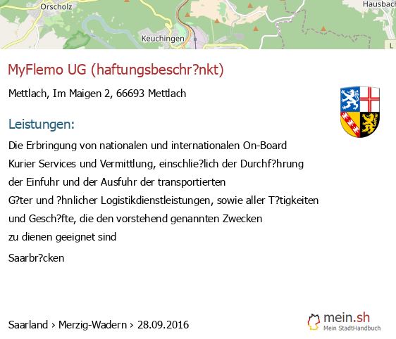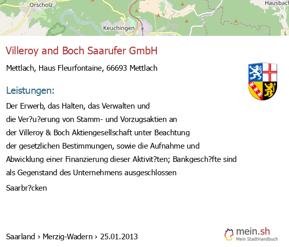 Die Informationen dieser Seite über Mettlach in Saarland wurden durch uns mit Recherche öffentlicher Landkreis Merzig-Wadern Quellen erstellt, und können fehlerbehaftet oder veraltet sein. Für Öffnungszeiten schauen Sie bitte auf die Seite der Mettlacher Anbieter. Für den Gesellschafter, die Bilanz, den Jahresabschluss, Umsatz und Gewinn empfehlen wir, den Bundesanzeiger zu nutzen. Wenn 66693 Mettlach Einträge aktualisiert oder entfernt werden müssen, geben Sie uns bitte einen Hinweis.