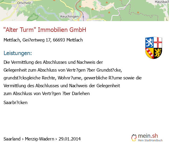 bei Mettlach seit 1/2014Leistungen: Die Vermittlung des Abschlusses und Nachweis der Gelegenheit zum Abschluss von Vertr?gen ?ber Grundst?cke, grundst?cksgleiche Rechte, Wohnr?ume, gewerbliche R?ume sowie die Vermittlung des Abschlusses und Nachweis der Gelegenheit zum Abschluss von Vertr?gen ?ber Darlehen..