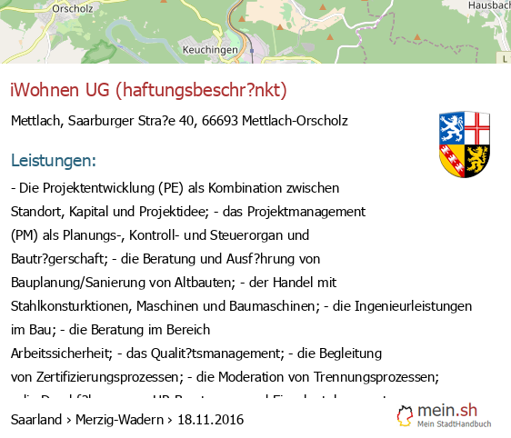 bei Mettlach seit 4/2016Leistungen: Die Projektierung von Investitionsprojekten und deren Vermarktung, Bau und Vermarktung/Verkauf von Bauprojekten, Immobilienverwaltung, insbesondere im Saarland gem..