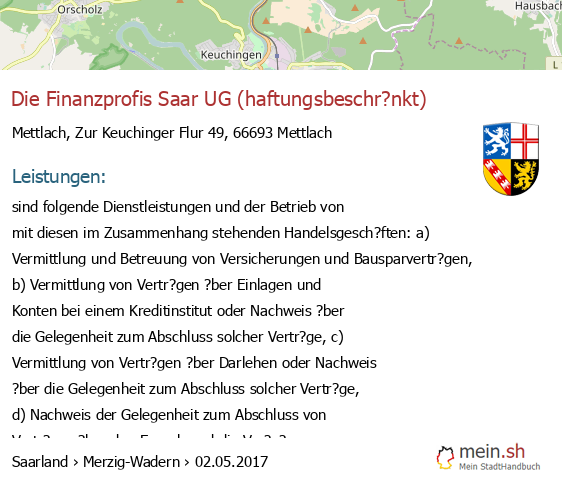 bei Mettlach seit 5/2017Leistungen: sind folgende Dienstleistungen und der Betrieb von mit diesen im Zusammenhang stehenden Handelsgesch?ften: a) Vermittlung und Betreuung von Versicherungen und Bausparvertr?gen, b) Vermittlung von Vertr?gen ?ber Einlagen und Konten bei einem Kreditinstitut oder Nachweis ?ber die Gelegenheit zum Abschluss solcher Vertr?ge, c) Vermittlung von Vertr?gen ?ber Darlehen oder Nachweis ?ber die Gelegenheit zum Abschluss solcher Vertr?ge, d) Nachweis der Gelegenheit zum Abschluss von Vertr?gen ?ber den Erwerb und die Ver?u?erung von Wertpapieren..