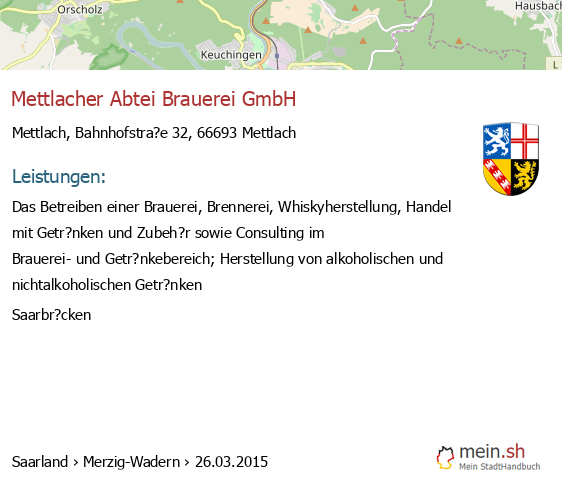 bei Mettlach seit 3/2015Leistungen: Das Betreiben einer Brauerei, Brennerei, Whiskyherstellung, Handel mit Getr?nken und Zubeh?r sowie Consulting im Brauerei- und Getr?nkebereich; Herstellung von alkoholischen und..