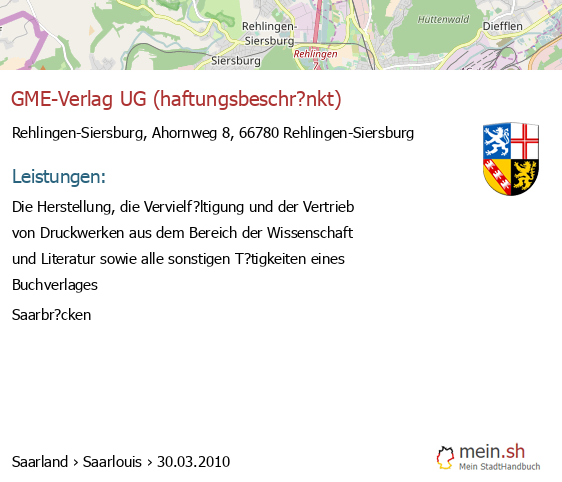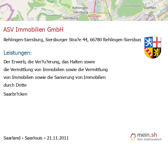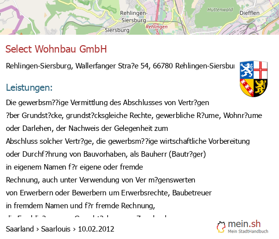 bei Rehlingen-Siersburg seit 10/2005Rehlingen-Siersburg (Zum Horst 61, 66780 Rehlingen-Siersburg, Die Vermietung und Verwaltung von Grundbesitz, insbesondere des gewerblichen Grundbesitzes in Saarlouis, Industriestra?e 19