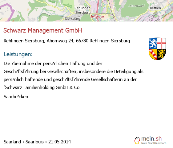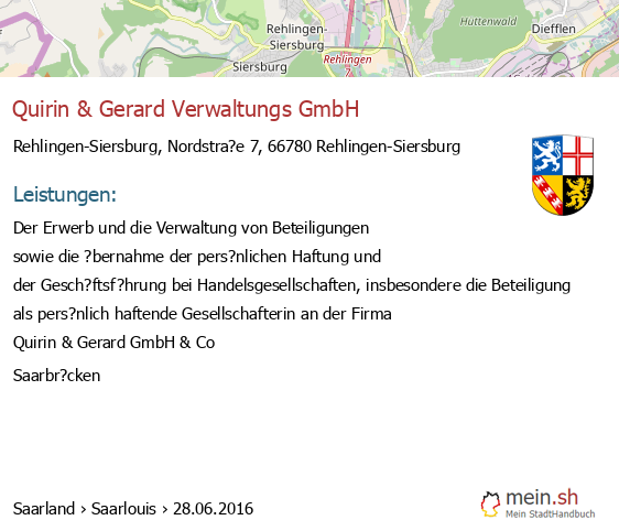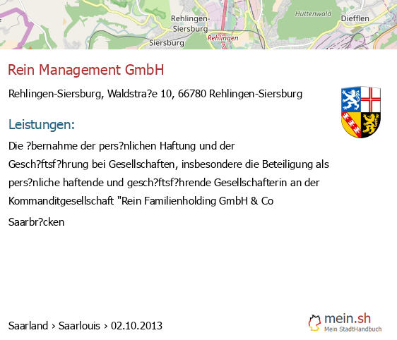 bei Rehlingen-Siersburg seit 6/2016Leistungen: Der Erwerb und die Verwaltung von Beteiligungen sowie die ?bernahme der pers?nlichen Haftung und der Gesch?ftsf?hrung bei Handelsgesellschaften, insbesondere die Beteiligung als pers?nlich haftende Gesellschafterin an der..