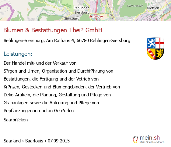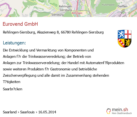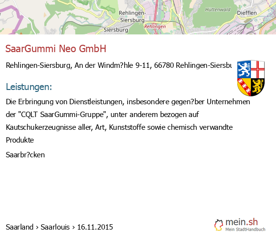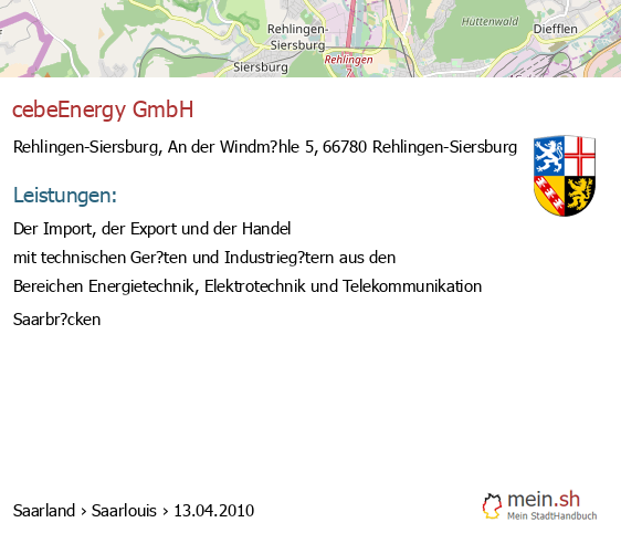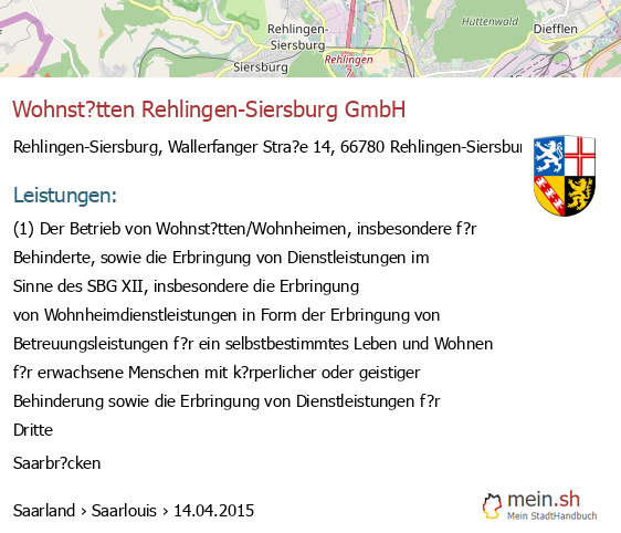 Die Informationen dieser Seite über Rehlingen-Siersburg in Saarland wurden durch uns mit Recherche öffentlicher Landkreis Saarlouis Quellen erstellt, und können fehlerbehaftet oder veraltet sein. Für Öffnungszeiten schauen Sie bitte auf die Seite der Rehlingen-Siersburger Anbieter. Für den Gesellschafter, die Bilanz, den Jahresabschluss, Umsatz und Gewinn empfehlen wir, den Bundesanzeiger zu nutzen. Wenn 66780 Rehlingen-Siersburg Einträge aktualisiert oder entfernt werden müssen, geben Sie uns bitte einen Hinweis.