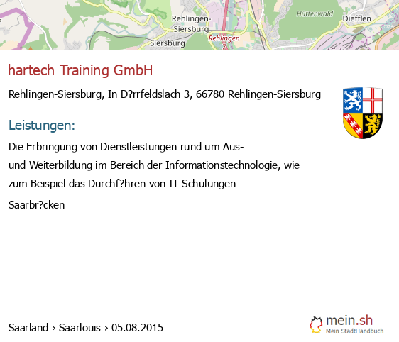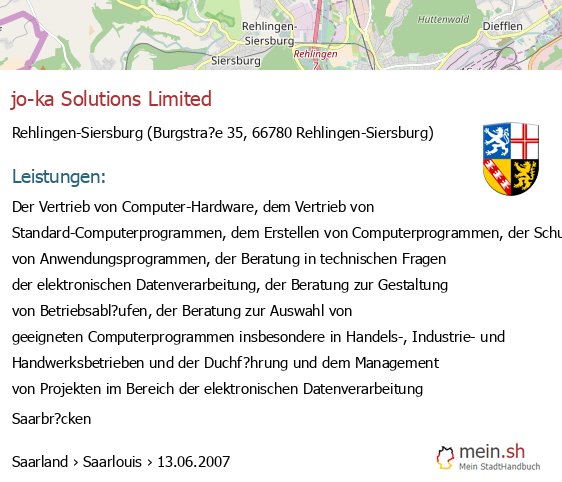 bei Rehlingen-Siersburg seit 6/2007Leistungen: Der Vertrieb von Computer-Hardware, dem Vertrieb von Standard-Computerprogrammen, dem Erstellen von Computerprogrammen, der Schulung von Anwendungsprogrammen, der Beratung in technischen Fragen der elektronischen Datenverarbeitung, der Beratung zur Gestaltung von Betriebsabl?ufen, der Beratung zur Auswahl von geeigneten Computerprogrammen insbesondere in Handels-, Industrie- und Handwerksbetrieben und..