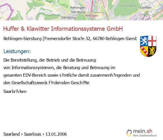 bei Rehlingen-Siersburg seit 1/2006Leistungen: Die Bereitstellung, der Betrieb und die Betreuung von Informationssystemen, die Beratung und Betreuung im gesamten EDV-Bereich sowie s?mtliche damit zusammenh?ngenden und den Gesellschaftszweck..