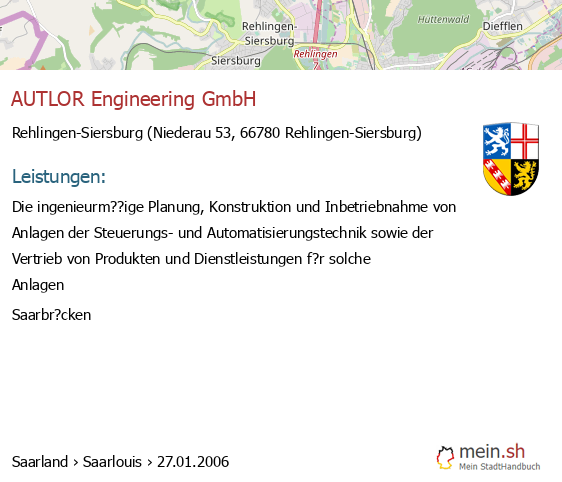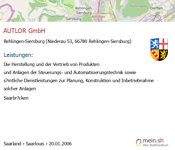 bei Rehlingen-Siersburg seit 1/2006Leistungen: Die Herstellung und der Vertrieb von Produkten und Anlagen der Steuerungs- und Automatisierungstechnik sowie s?mtliche Dienstleistungen..