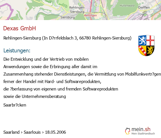 bei Rehlingen-Siersburg seit 5/2006Leistungen: Die Entwicklung und der Vertrieb von mobilen Anwendungen sowie die Erbringung aller damit im Zusammenhang stehender Dienstleistungen, die Vermittlung von Mobilfunkvertr?gen, ferner der Handel mit Hard- und Softwareprodukten, die ?berlassung von eigenen und fremden Softwareprodukten sowie die Unternehmensberatung.