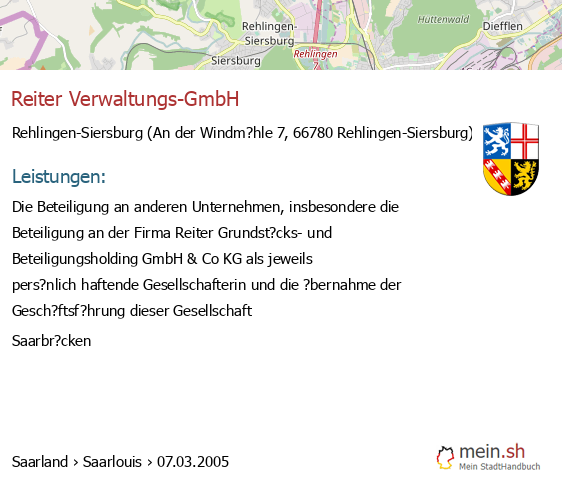 bei Rehlingen-Siersburg seit 3/2005Leistungen: Die Beteiligung an anderen Unternehmen, insbesondere die Beteiligung an der Firma Reiter Grundst?cks- und Beteiligungsholding GmbH & Co KG als jeweils pers?nlich haftende Gesellschafterin und die ?bernahme der Gesch?ftsf?hrung dieser Gesellschaft..