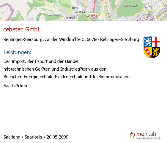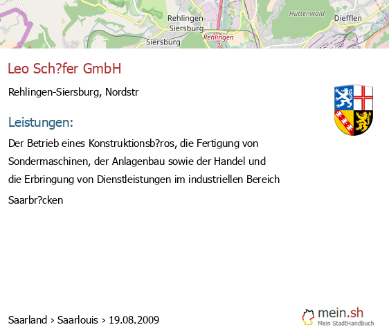 bei Rehlingen-Siersburg seit 1/2005Rehlingen-Siersburg (Nordstra?e 8, 66780 Rehlingen-Siersburg, Unternehmensgegenstand: Der Betrieb eines Konstruktionsb?ros, die Fertigung von Sondermaschinen, der Anlagenbau sowie der Handel und die Erbringung von Dienstleistungen im industriellen Bereich
