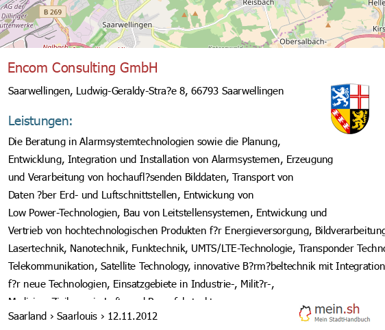 bei Saarwellingen seit 8/2008Leistungen: Handel, Service und Beratung im EDV- und Telekommunikations-Bereich, insbesondere Dienstleistungen im Bereich der IT-Administration (einschlie?lich Betreuung und Wartungsarbeiten, Installation von Hardware- und Software und Software-Updates, Datensicherung, Administration von Nutzern, Mailing- und Groupware-Systemen), Application Service Providing, Outsourcing von Hardware und Technik mit zentralem Support, Netzwerk- und Systemmanagement einschlie?lich Hardware- und Software-Vermietung/ -Leasing, der Vermietung/ Untervermietung von Rechenzentrumskapazit?ten einschlie?lich der hierf?r erforderlichen Datenleitungen und allen damit zusammenh?ngenden T?tigkeiten..