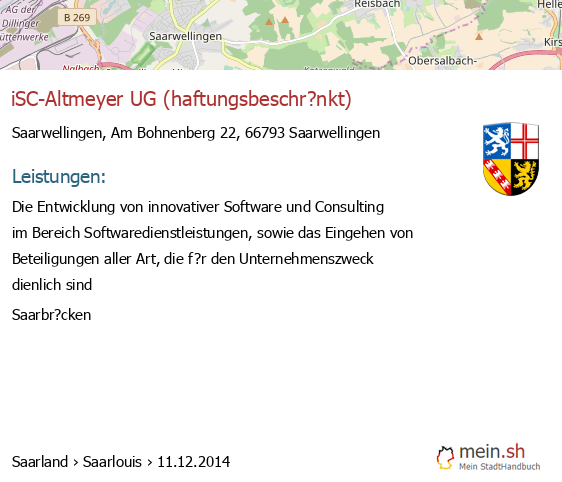 Die Informationen dieser Seite über Saarwellingen in Saarland wurden durch uns mit Recherche öffentlicher Landkreis Saarlouis Quellen erstellt, und können fehlerbehaftet oder veraltet sein. Für Öffnungszeiten schauen Sie bitte auf die Seite der Saarwellingener Anbieter. Für den Gesellschafter, die Bilanz, den Jahresabschluss, Umsatz und Gewinn empfehlen wir, den Bundesanzeiger zu nutzen. Wenn 66793 Saarwellingen Einträge aktualisiert oder entfernt werden müssen, geben Sie uns bitte einen Hinweis.