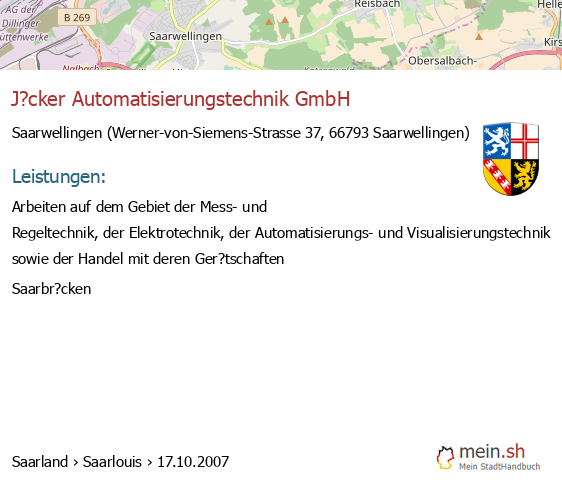 bei Saarwellingen seit 10/2007Leistungen: Arbeiten auf dem Gebiet der Mess- und Regeltechnik, der Elektrotechnik, der Automatisierungs- und Visualisierungstechnik sowie der Handel..