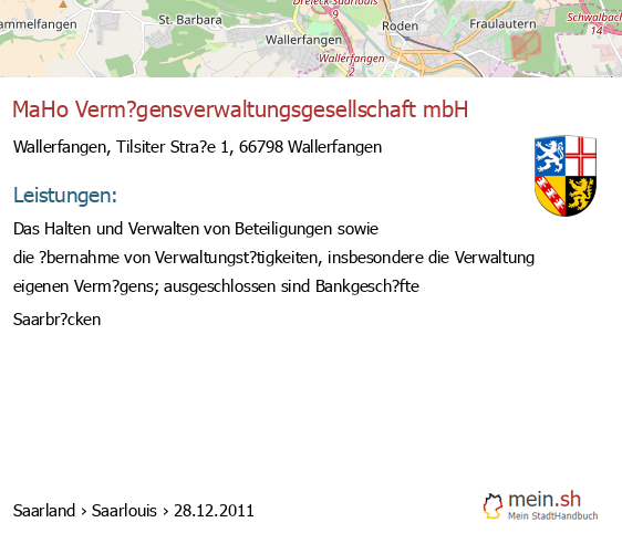 bei Wallerfangen seit 7/2006Wallerfangen (In der Kasheck 1, 66798 Wallerfangen; Verwaltung von Beteiligungen an Kapitalgesellschaften und Personengesellschaften