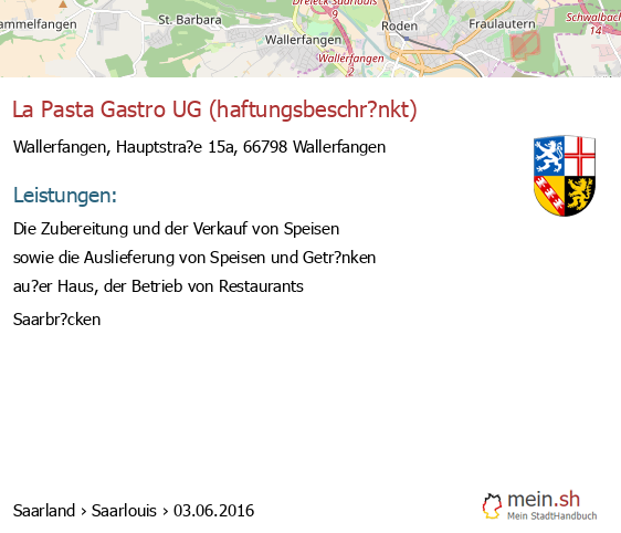 bei Wallerfangen seit 6/2016Leistungen: Die Zubereitung und der Verkauf von Speisen sowie die Auslieferung von Speisen und Getr?nken au?er Haus, der Betrieb..