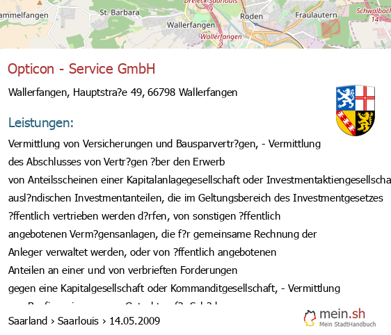 bei Wallerfangen seit 5/2009Leistungen: Vermittlung von Versicherungen und Bausparvertr?gen, - Vermittlung des Abschlusses von Vertr?gen ?ber den Erwerb von Anteilsscheinen einer Kapitalanlagegesellschaft oder Investmentaktiengesellschaft, von ausl?ndischen Investmentanteilen, die im Geltungsbereich des Investmentgesetzes ?ffentlich vertrieben werden d?rfen, von sonstigen ?ffentlich angebotenen Verm?gensanlagen, die f?r gemeinsame Rechnung der Anleger verwaltet werden, oder von ?ffentlich angebotenen Anteilen an einer und von verbrieften Forderungen gegen..
