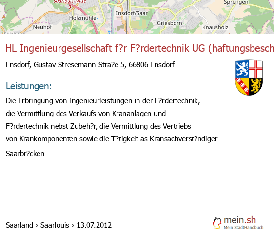 bei Ensdorf seit 7/2012Leistungen: Die Erbringung von Ingenieurleistungen in der F?rdertechnik, die Vermittlung des Verkaufs von Krananlagen und F?rdertechnik nebst Zubeh?r, die Vermittlung des Vertriebs von Krankomponenten sowie die T?tigkeit as Kransachverst?ndiger..