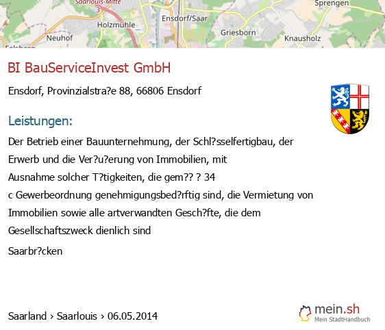 bei Ensdorf seit 5/2014Leistungen: Der Betrieb einer Bauunternehmung, der Schl?sselfertigbau, der Erwerb und die Ver?u?erung von Immobilien, mit Ausnahme solcher T?tigkeiten, die gem?? ? 34 c Gewerbeordnung genehmigungsbed?rftig sind, die Vermietung von Immobilien..