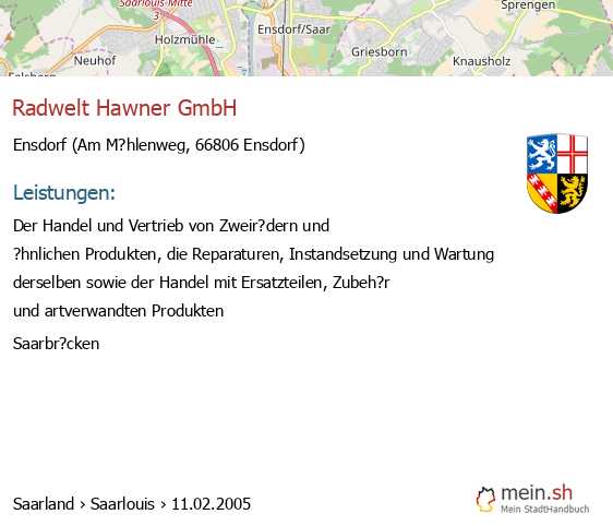 bei Ensdorf seit 2/2005Leistungen: Der Handel und Vertrieb von Zweir?dern und ?hnlichen Produkten, die Reparaturen, Instandsetzung und Wartung derselben sowie der Handel mit Ersatzteilen, Zubeh?r und..