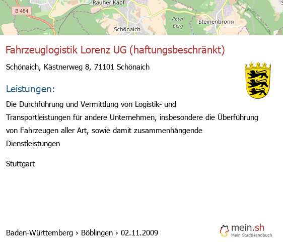 bei Schönaich seit 11/2009Leistungen: Die Durchführung und Vermittlung von Logistik- und Transportleistungen für andere Unternehmen, insbesondere die Überführung von Fahrzeugen aller Art, sowie damit zusammenhängende..