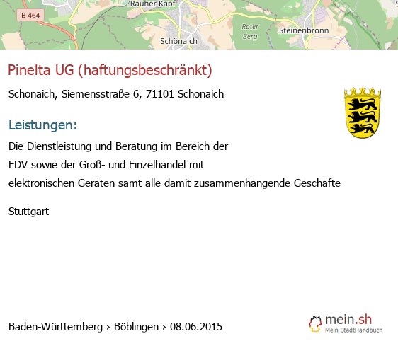 bei Schönaich seit 6/2015Leistungen: Die Dienstleistung und Beratung im Bereich der EDV sowie der Groß- und Einzelhandel mit elektronischen Geräten samt alle..