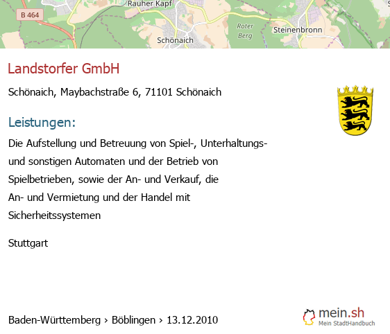 bei Schönaich seit 12/2010Leistungen: Die Aufstellung und Betreuung von Spiel-, Unterhaltungs- und sonstigen Automaten und der Betrieb von Spielbetrieben, sowie der An- und Verkauf, die An- und Vermietung und..