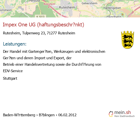 bei Rutesheim seit 2/2012Leistungen: Der Handel mit Gartenger?ten, Werkzeugen und elektronischen Ger?ten und deren Import und Export, der Betrieb einer Handelsvertretung sowie die Durchf?hrung..