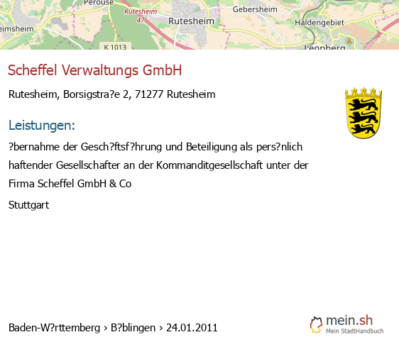 bei Rutesheim seit 2/2012Leistungen: Die ?bernahme und Verwaltung von Beteiligungen an Unternehmen aller Art, sowie die Gesch?ftsf?hrung f?r solche Unternehmen, insbesondere die Beteiligung als pers?nlich haftender Gesellschafter an der..