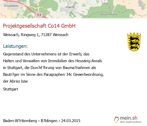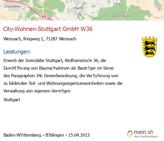 bei Weissach seit 3/2015Leistungen: Der Erwerb, das Halten und Verwalten von Immobilien des Heusteig-Areals in Stuttgart, die Durchf?hrung von Bauma?nahmen als Bautr?ger im Sinne des Paragraphen 34c Gewerbeordnung, die bauliche Weiterentwicklung und Sanierung denkmalgesch?tzter Geb?ude zur Bildung von Wohnungs- und Teileigentum, der Verkauf von gebildetem Wohnungs- und Teileigentum sowie die Verwaltung..