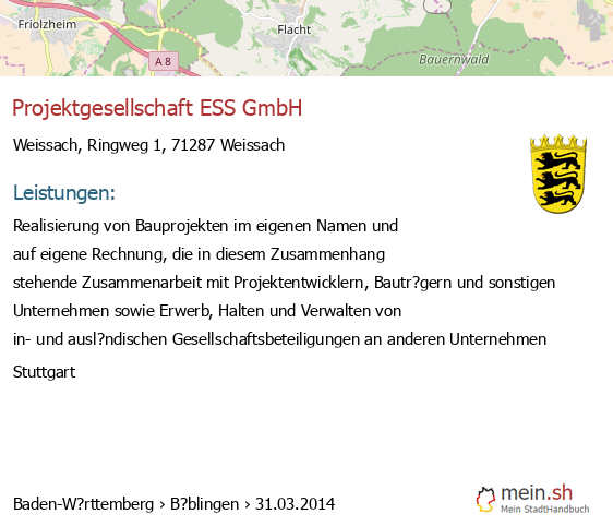 bei Weissach seit 9/2016Leistungen: Erwerb, Halten und Verwalten von Grundst?cken, grundst?cksgleichen Rechten, Wohnungs-und Teileigentum.